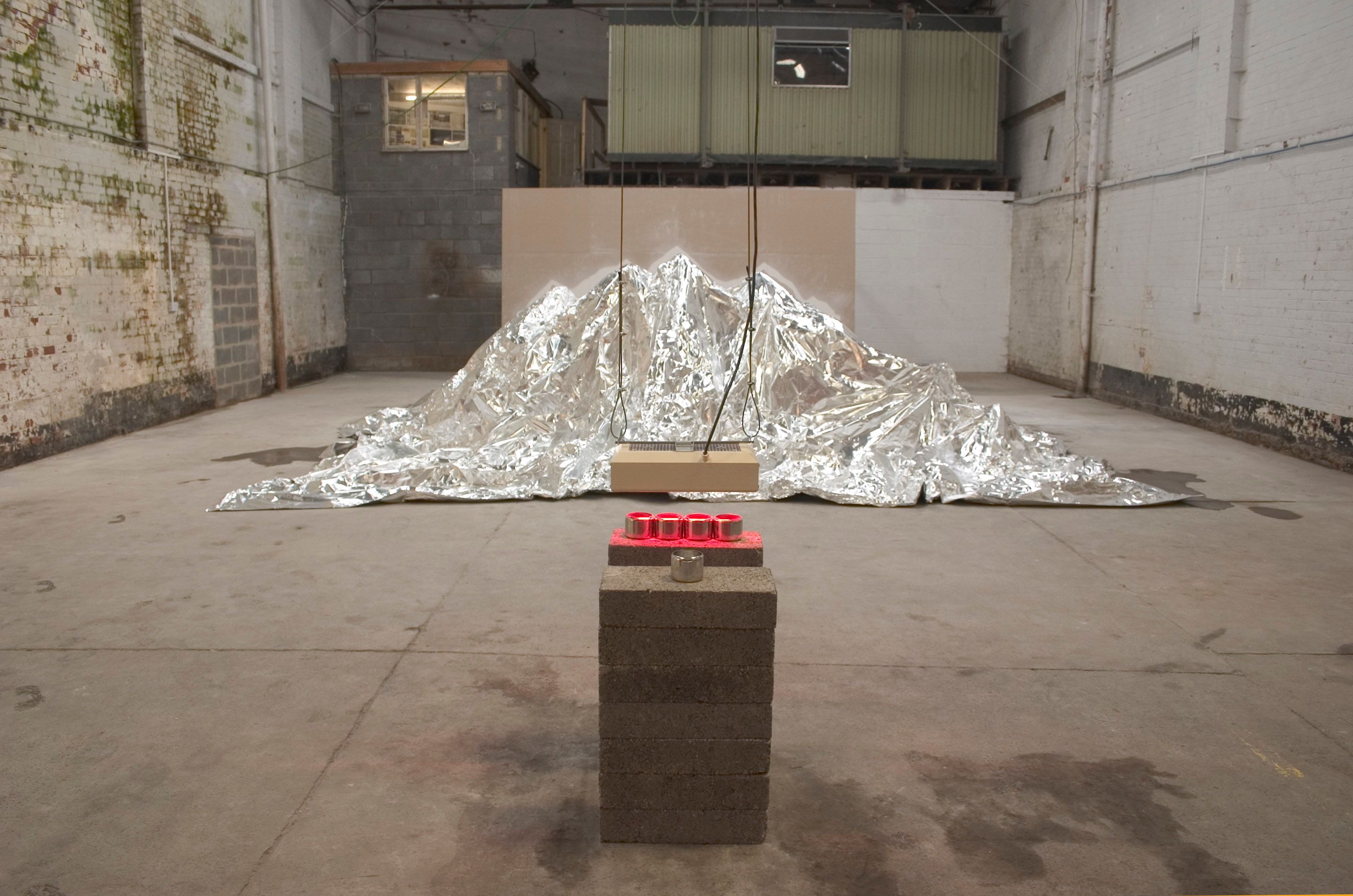 Evian mountian built with tables, chairs, tin foil. Above a greenhouse mister rains on the mountain.