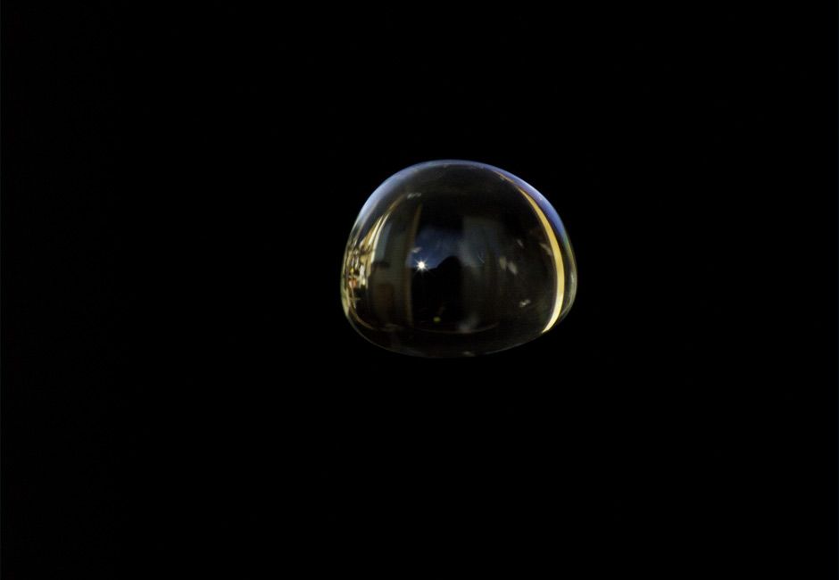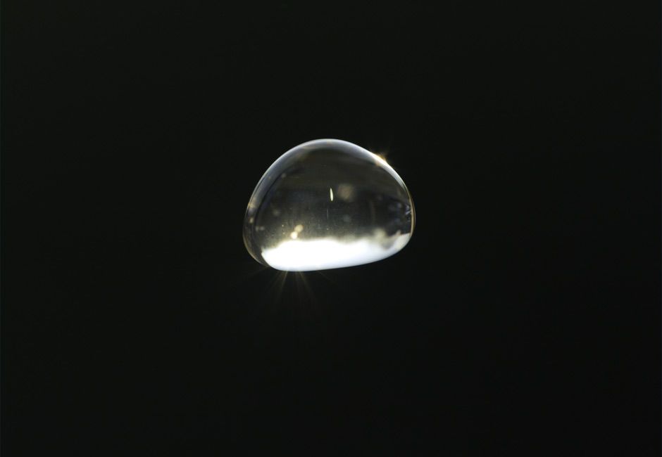 "Raindrop comprises a machine built to allow a drop of water to hover in mid air. Viewing this translucent, jewel-like object instils a very bodily sense of unease. Arrested in free-fall, its form mechanically maintained in a seeming repudiation of basic physics, the stationary raindrop throws us off balance, making us feel as though we were plummeting to the ground in its place."
