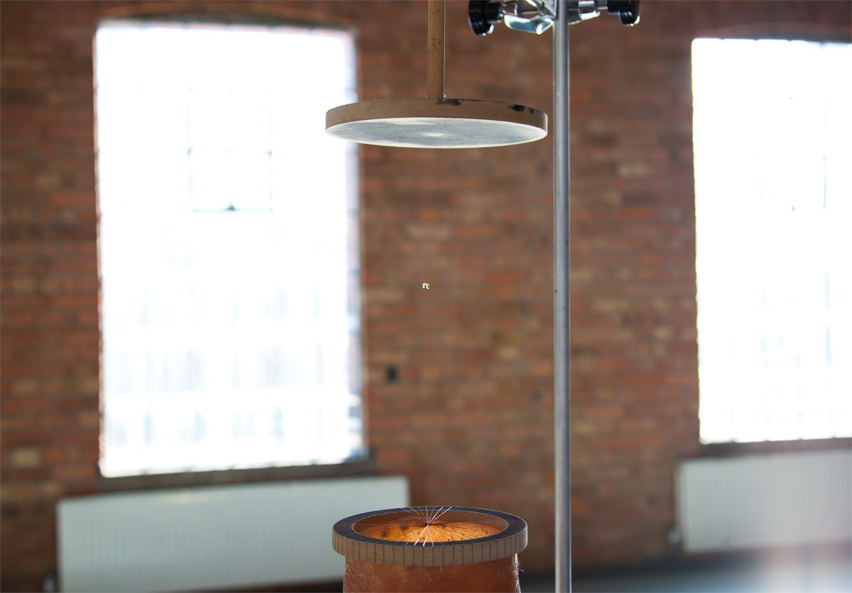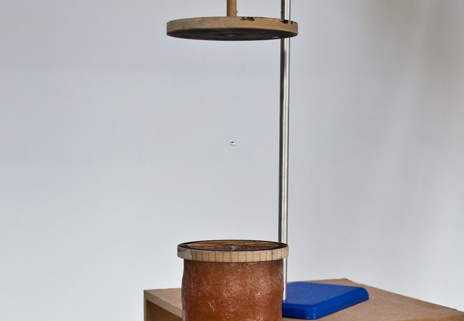 The machine was developed over a two year long process of experimentation, from the moment Saunders gave McClymont a copy of the research paper and the artist subsequently visited the laboratory in Manchester. Raindrop is a unique machine, using the same principle as the original experiment. The installation includes a human who must replace the drop as it evaporates, injecting a new drop into the machine with a syringe.